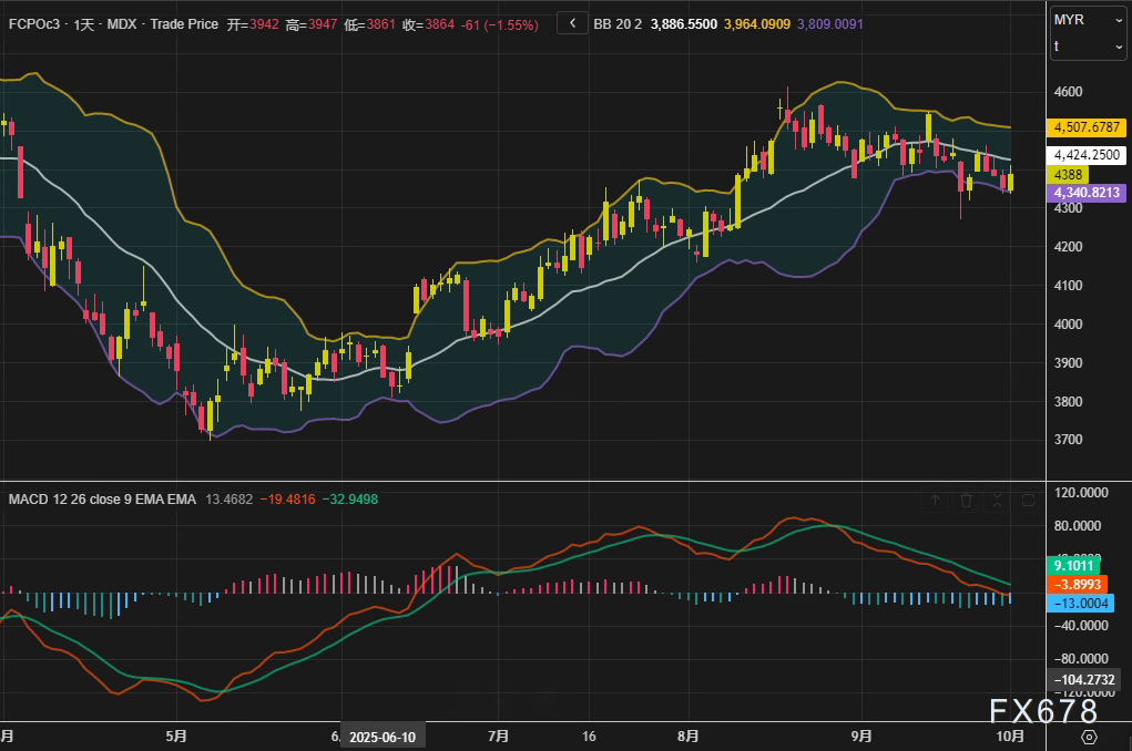 从技术层面观察,棕榈油合约日线布林带中轨与下轨分别位于3964林吉特与3809林吉特附近,当前价格已脱离超卖区间。MACD指标虽仍处于负值区间,但柱状线收窄至-32.95,显示下跌动能减弱。部分交易员认为,若价格能稳固于4350林吉特支撑位上方,短期或进一步上探4450-4480压力区域。