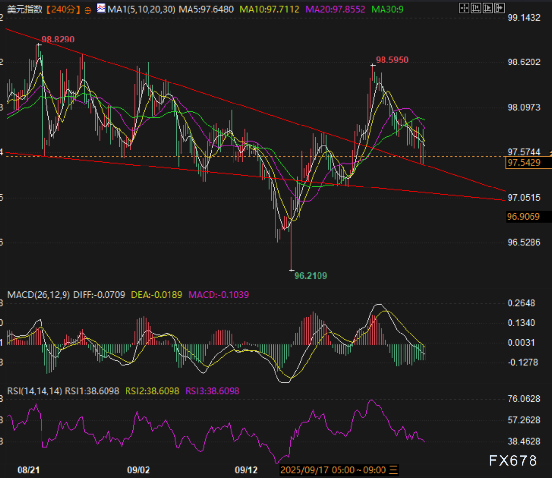 薪资方面,9月在职员工年薪同比增长4.5%略高于GDP,增速保持稳定;跳槽员工年薪增长6.6%,较8月的7.1%有所放缓,稍微削弱市场对通胀的担忧,报告提及8月就业数据从新增5.4万个修正为减少3000个,叠加9月就业岗位的收缩,进一步强化了美国劳动力市场“增长动能减弱”的趋势,叠加预期通胀的缓解,进一步增加了市场对美联储继续降息的押注,压制了美元指数的反弹。