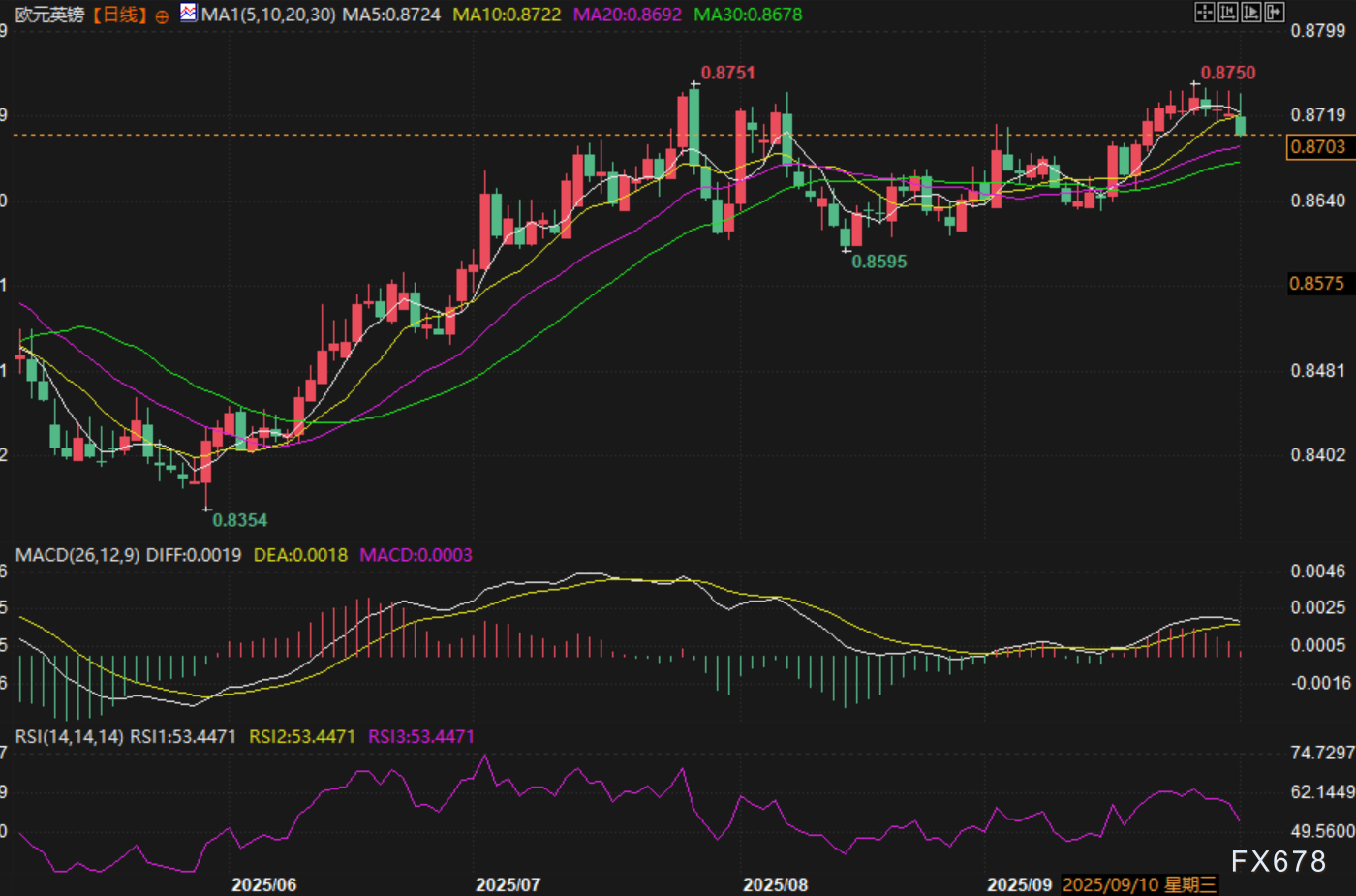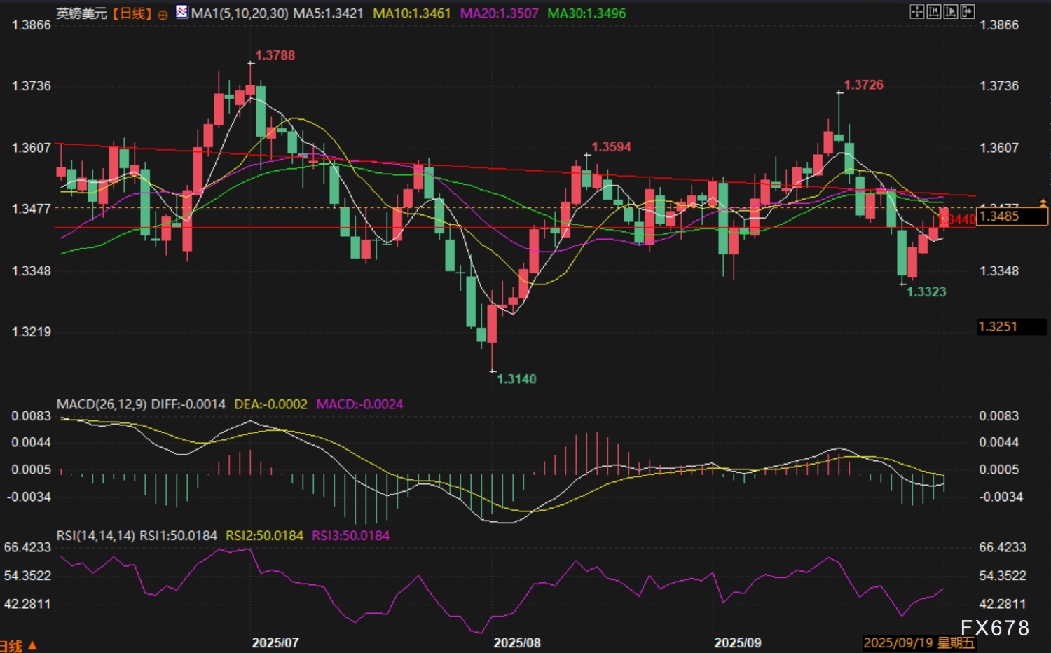 周三,英镑对美元汇价连续第四个交易日延续反弹。目前受到20、30日均线以及头肩底形态颈线压制。