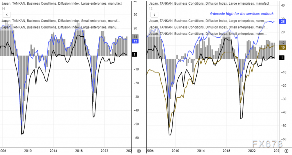 受日本央行可能收紧政策的新预期推动,日元本周延续涨势。尽管日本央行维持利率不变,但两名理事对决议提出异议,显示出政策调整的呼声渐涨。季度短观调查亦凸显经济韧性,大型制造业指数攀升至14点,服务业景气指数更以28点创四十年新高。
