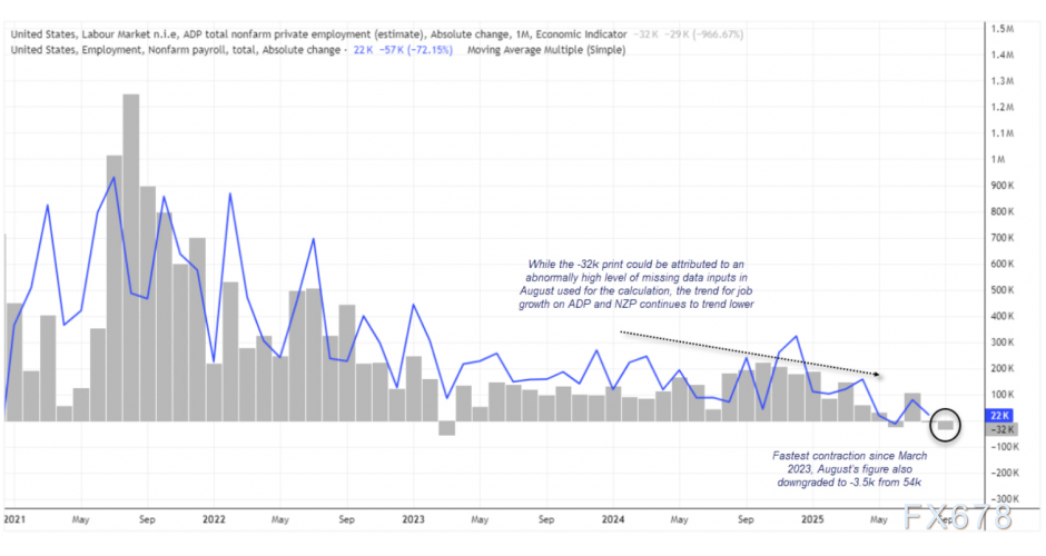 疲软的ADP私营就业报告引发美联储降息新预期,美元与美债收益率承压。-3.2万人的数据创下2023年3月以来最快萎缩纪录,而8月数据更从5.4万人被大幅下修至-0.35万人。不过当获悉因9月数据录入缺失导致统计“粒度较往年明显粗糙”后,市场忧虑有所缓解。