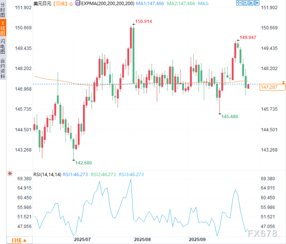 美元兑日元此前已连续四个交易日下跌,每日波动区间持续下探,RSI处于中线下方,强化看跌趋势。