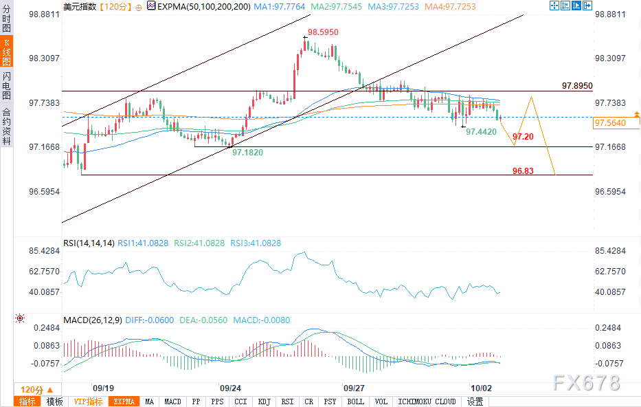 若美元指数未能收复97.89的阻力位,可能会向下测试97.20,进一步支撑位在96.83和96.23。