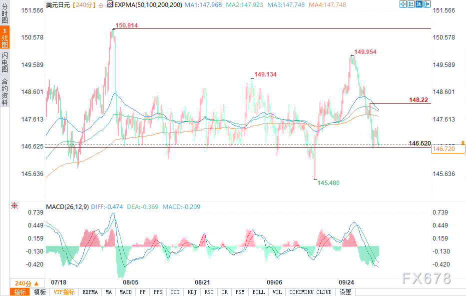 若汇率向下跌破这一区间,可能进一步延续跌势至146.50。