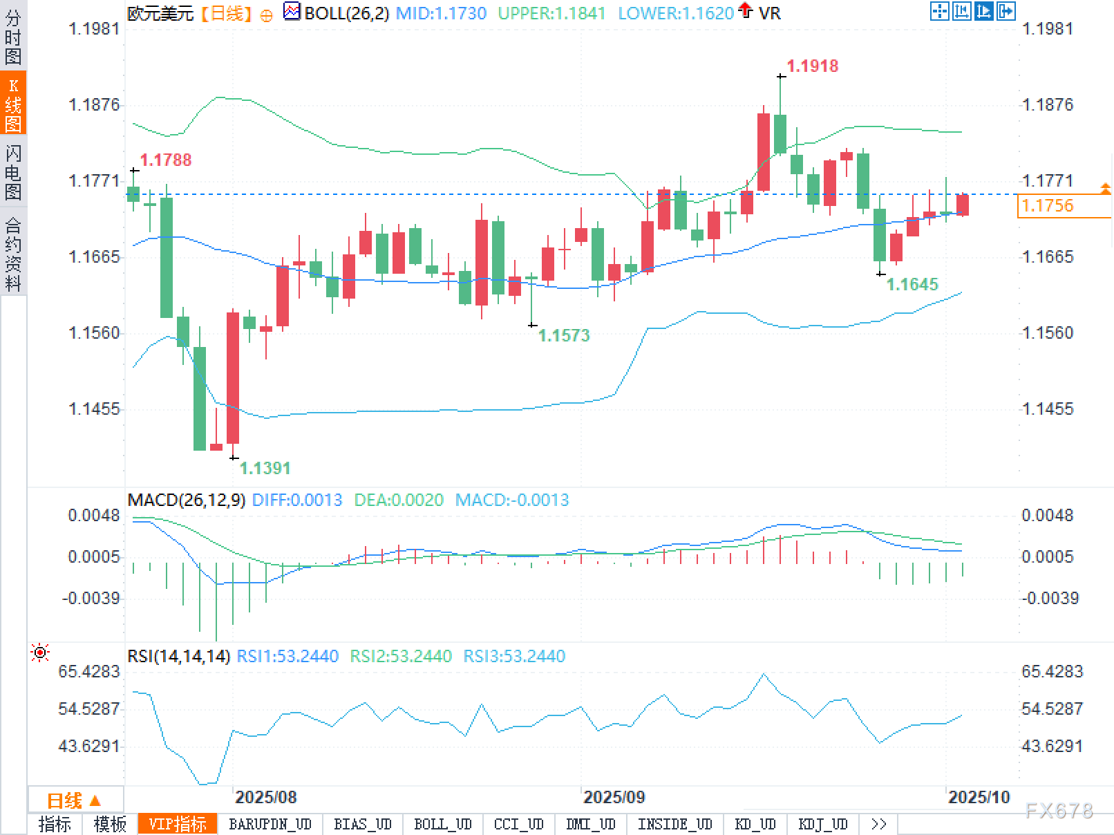 日线显示布林带轻度收敛,布林中轨1.1730、上轨1.1841、下轨1.1620;汇价现紧贴中轨上方运行,均值回归后的再平衡尚未打破,呈“布林带挤压+水平通道”的盘整格局。