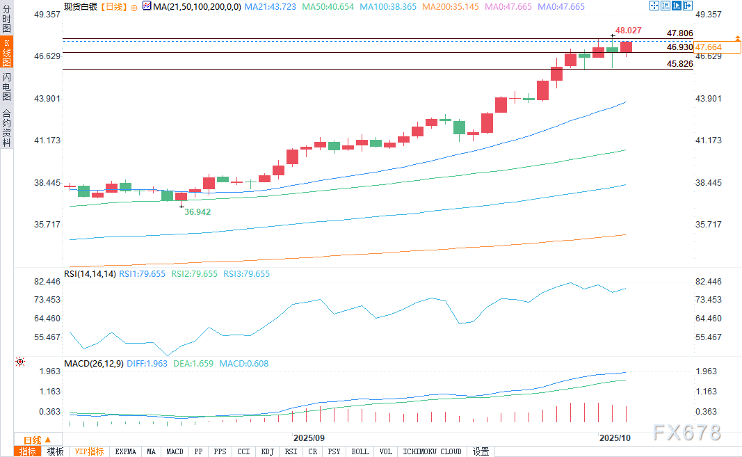 exness外汇官网——周五(10月3日)欧盘时段,现货白银走势坚挺,价格维持在关键技术支撑位46.93美元上方,多头正计划再次冲击48.03美元的多年高点。尽管美国国债收益率因政府数据发布暂停而小幅走高,但市场对美联储短期降息的信心增强、美元走弱,为白银提供了支撑。