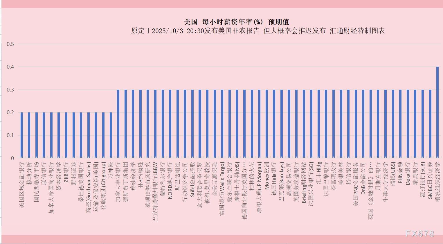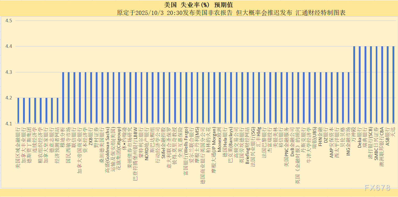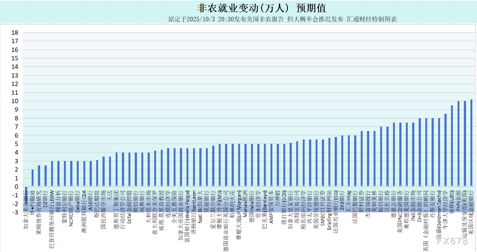 原定于周五(2025/10/3 20:30)发布美国9月非农就业报告,虽然很可能推迟发布,但全球投行/机构的预期值已准时出来了。据全球逾72个国际知名投行/金融大咖的预测结果来看,非农就业变动预期:增5万,失业率预期:4.3%,平均时薪年率预期:仅0.3%。若今晚推迟发布,持续跟进快讯内容查看最新动态。