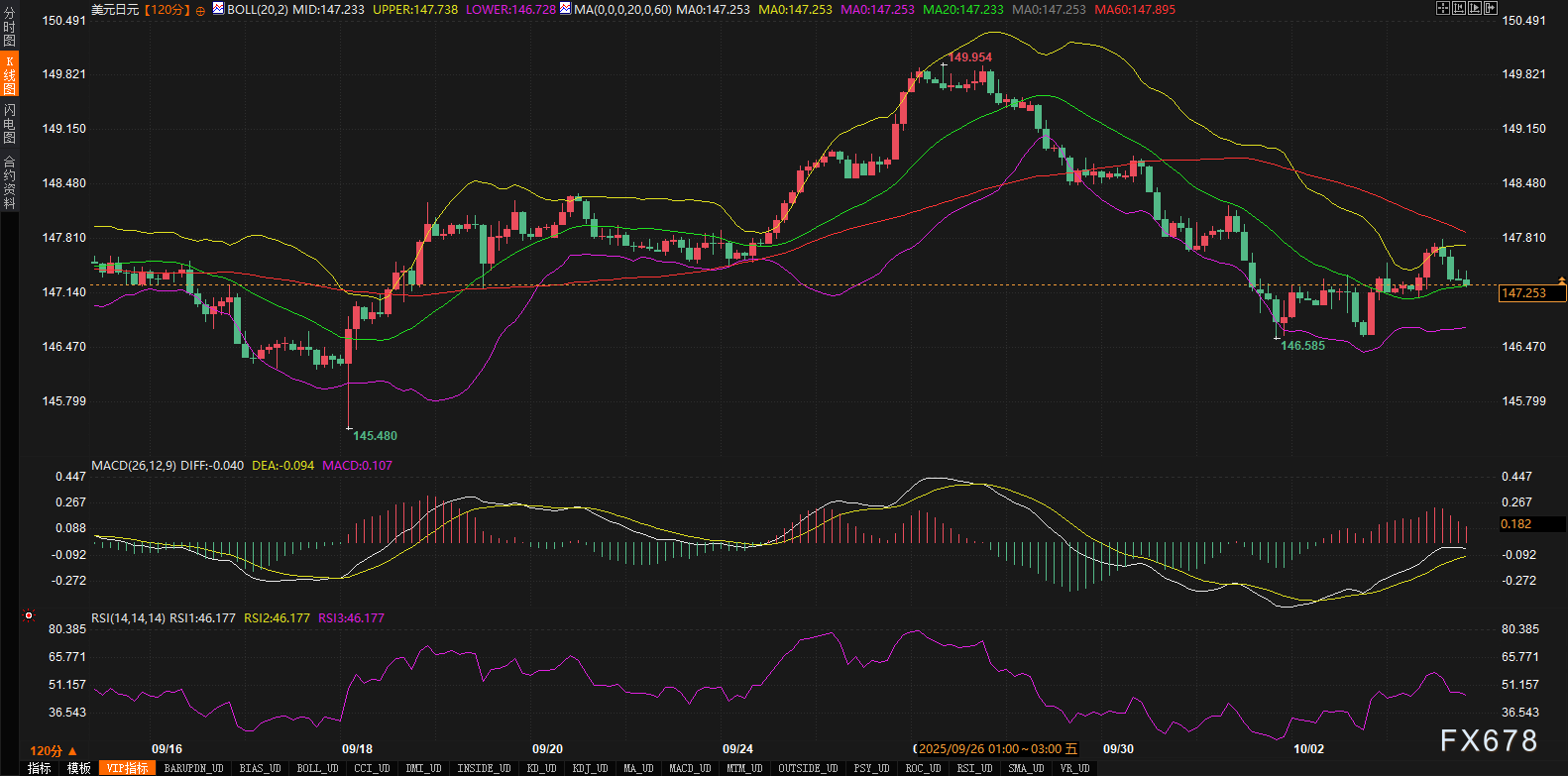 转向240分钟图,美元兑日元当前价格147.281正紧贴布林带中轨147.233,处于支撑与阻力的微妙转换区。从9月26日高点149.554后的快速回落看,整个回调趋势仍主导大局,近期K线虽勾勒出小幅反弹轮廓,但上方MA20与MA40的粘合,以及布林上轨147.738的压制,形成了一道密集的短期阻力壁垒。若无强劲基本面助力,价格难以确立反转逻辑,更可能在回调框架内延续震荡整理。
