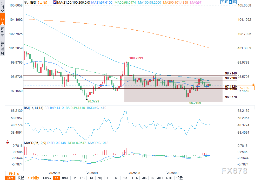 exness外汇官网——周五(10月3日)午盘时段,美元指数下跌0.1%,至97.74,预计将录得周度跌幅,且这将是自7月以来的最大单周跌幅。从价格走势来看,该指数始终难以收复50日均线(98.046),这一关键技术位本周一直是交易员的防守重点。