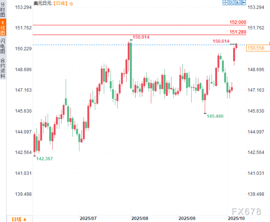 exness外汇官网——周二(10月7日),美元/日元延续涨势,一度达150.61的两个月高点。因东京政治变动导致日元大幅抛售。有报道称支持经济刺激的候选人和日本央行加息的公开批评者高市早苗有望成为日本首位女首相,市场对此作出反应,引发日元普遍下跌,并重新激发对利差交易的兴趣。
