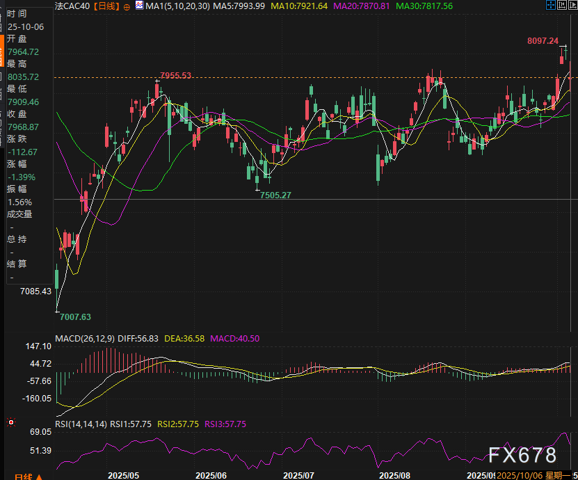局势演变节奏较快,但法国在政治层面再度陷入“治理真空”状态,这一态势同步对股市形成压制。法国CAC40指数单日下跌1.77%,表现跑输其他欧洲主要股指。跌幅居前的板块集中于奢侈品领域,如爱马仕(Hermes)、路威酩轩(LVMH)。尽管政治局势未必直接冲击此类企业,但法国规模最大、声望最高的企业今日遭集中抛售,这一信号表明投资者正大范围抛售法国资产,而潜在风险在于,此趋势或向其他市场传导。