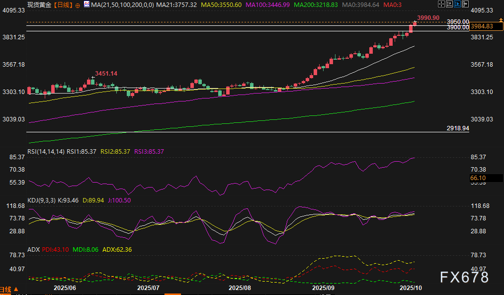 平均趋向指数(ADX)读数高于62,反映趋势强度依然强劲。但“强劲趋势+极端动量读数”的组合警示,当前涨势可能已接近衰竭,黄金短期回调至更低支撑位的风险上升。