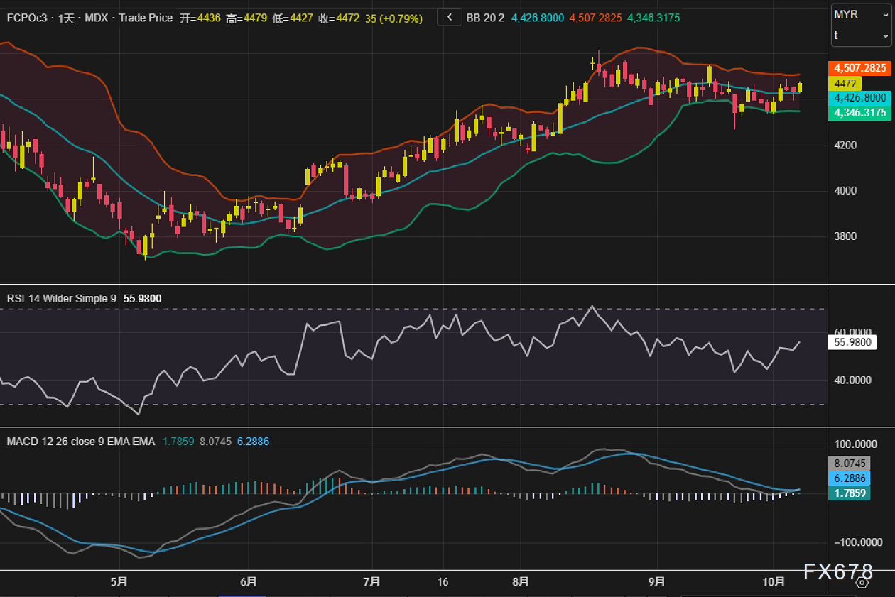 exness外汇官网——周二(10月7日),马来西亚棕榈油期货结束两日连跌,主力合约FCPOc3收报4472林吉特/吨,单日上涨35林吉特,涨幅0.79%。技术面上,布林带上轨位于4507林吉特附近,MACD柱状线收于6.29,快慢线呈多头排列,显示短期动能转向积极。