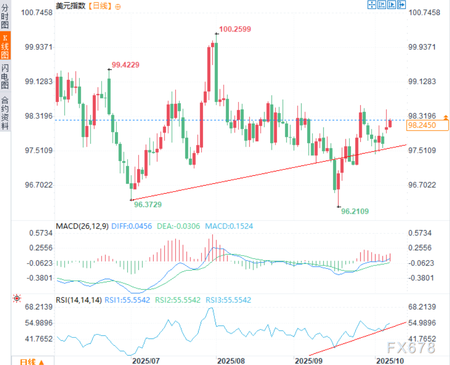 exness外汇官网——周二(10月7日)亚欧时段,美元指数连续第二个交易日温和走强,目前交投于98.25附近。该指数衡量美元对六大主要货币的表现。