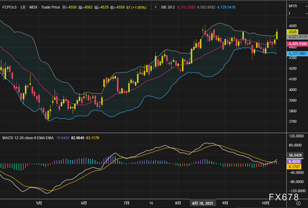 exness外汇官网——周三(10月8日),马来西亚衍生品交易所棕榈油主力合约FCPOc3收于4546林吉特/吨,单日大幅上涨76林吉特,涨幅达1.7%,创下自8月18日以来的最高收盘价。技术面上,布林带上轨已上移至4503林吉特附近,而MACD柱状线扩大至63.12,显示市场做多动能显著增强。