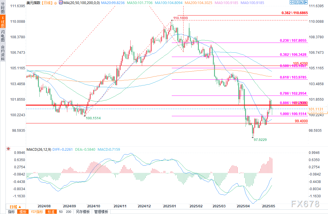 exness——周三(5月14日)欧盘时段,美元指数(DXY)盘中跌至100.58,下跌0.40%。此前,投资者因低于预期的通胀数据和缓和的贸易紧张局势,重新调整了对美联储政策的预期。