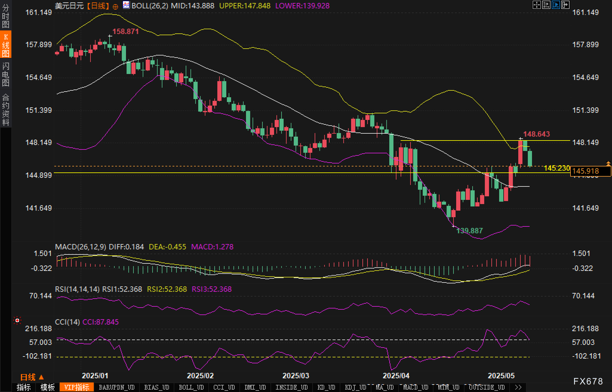 值得注意的是,汇价曾在4月下旬探至139.887的低点,随后出现显著反弹,形成一个潜在的双底形态。如果汇价能够站稳在145.00上方,这一看涨形态将得到确认,可能引发进一步上行至148.00甚至更高水平。
