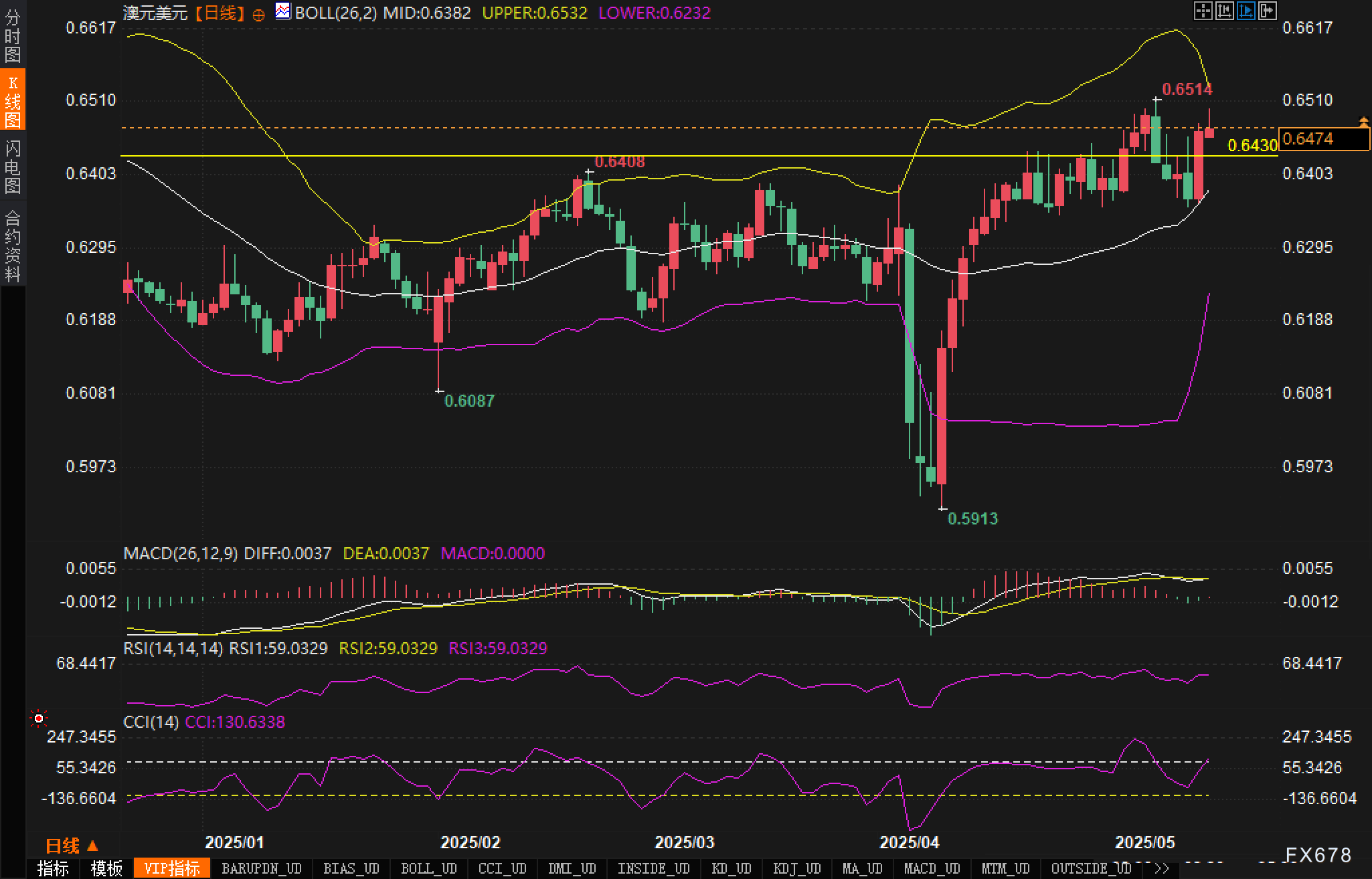 从澳元/美元日线图分析,汇价近期走势呈现明显的V型反转格局。在4月初跌至0.5913低点后,汇价展开了强劲反弹,目前已接近布林带上轨0.6532一线。汇价在4月中旬突破布林带中轨后,维持了上升趋势,并在近期再次成功突破0.6430阻力位。