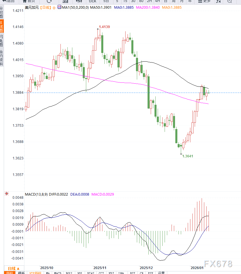 这一组合显示通胀压力正在温和缓解,但尚不足以促使政策立场发生明显转向。 值得注意的是,尽管通胀有所降温,美国劳动力市场依然表现出较强韧性。 此前公布的非农就业数据超预期,失业率下降,加之ADP就业数据的四周均值保持稳健,均强化了市场对美国经济基本面相对强劲的判断,为美元提供持续支撑。 不过,USD/CAD的上行空间可能受到加元因素的制约。作为典型的商品货币,加元往往受油价波动影响显著。当前西德克萨斯中质原油(WTI)价格徘徊在每桶60.70美元附近,接近两个月高位,为加元提供一定支撑。 exness官网:油价走强主要受到地缘局势推动。近期,美国暂停与伊朗方面的接触,并公开表达对当地示威者的支持,引发市场对局势升级的担忧。伊朗持续动荡叠加潜在外部介入风险,威胁其约330万桶/日的原油产量。 同时,美国方面警告称,继续与伊朗开展业务的国家可能面临新的25%关税,加剧了市场对原油供应受扰的担忧,从而推升油价。 从日线结构来看,USD/CAD整体仍运行在上升通道内,汇价维持在主要均线系统之上,显示中期趋势偏多。近期价格回升并重新逼近1.3900关口,表明多头动能尚未完全消退。 技术指标方面,日线RSI位于中性偏强区域,尚未进入明显超买状态,意味着汇价仍具备一定上行空间,但动能并不极端。 若RSI进一步走高,短线波动可能随之放大。 关键价位上,1.3920—1.3950区间构成阶段性阻力,一旦有效突破,汇价或有机会测试前期高点; 下方支撑则关注1.3820—1.3850区域,该位置同时接近短期均线密集带,若失守,汇价可能转入高位震荡甚至小幅回调。 整体来看,日线技术形态偏多,但上行节奏可能放缓,更倾向于震荡中缓慢抬升。