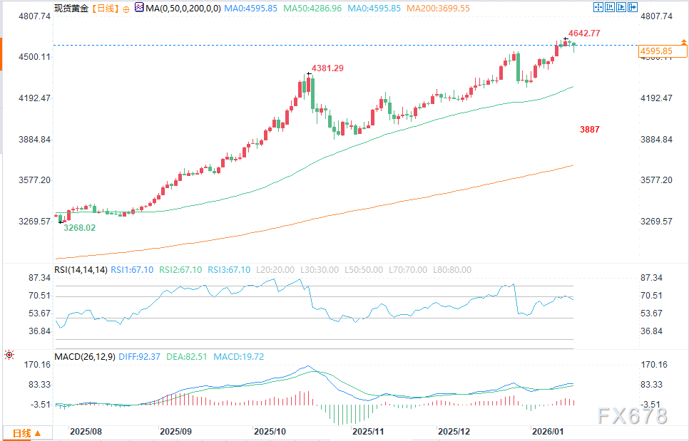 周三,金价触及4642.97美元的历史峰值,随后涨势动能减弱,原因是特朗普淡化了对伊朗采取军事打击的预期。尽管如此,降息预期与避险买盘仍为市场提供强劲支撑。