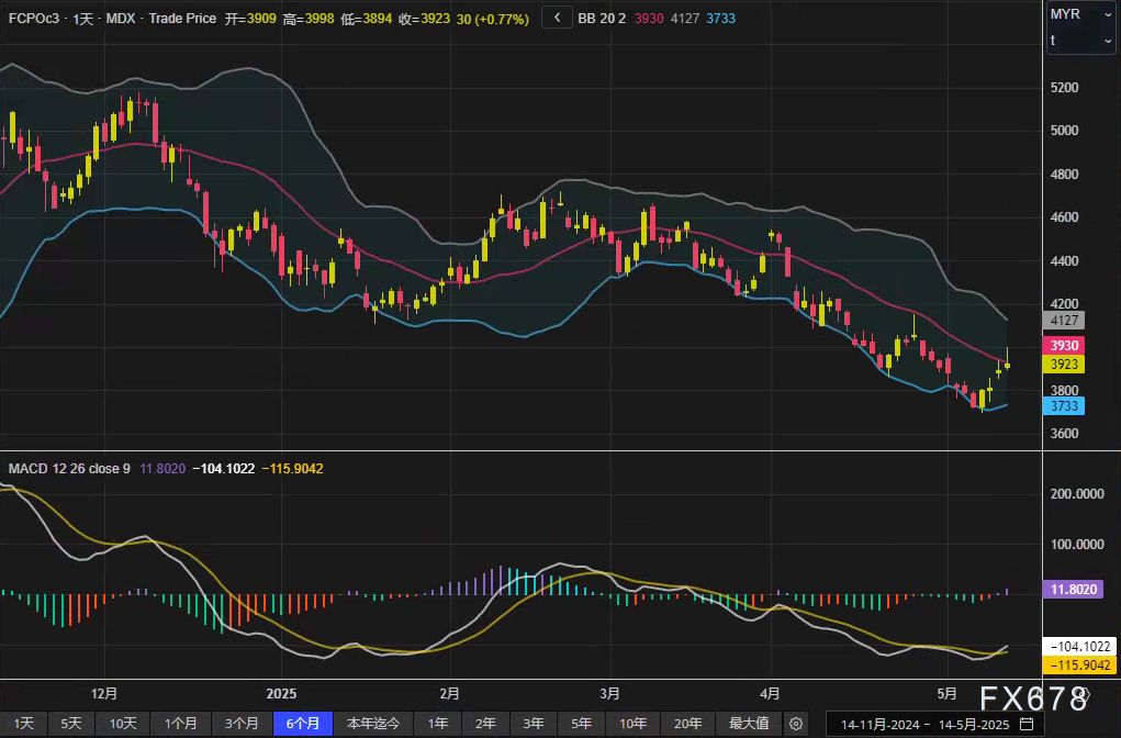exness——周三(5月14日),马来西亚衍生品交易所(BMD)棕榈油主力合约FCPOc3连续第四个交易日收涨,7月合约收盘报3925林吉特/吨,日内涨幅0.82%。技术面显示,价格站稳布林通道中轨3930林吉特上方,但MACD柱状线仍位于零轴以下,反映市场反弹动能尚未形成趋势性反转。日内行情主要受大连植物油走强带动,但林吉特兑美元汇率升值0.81%抑制了涨幅。