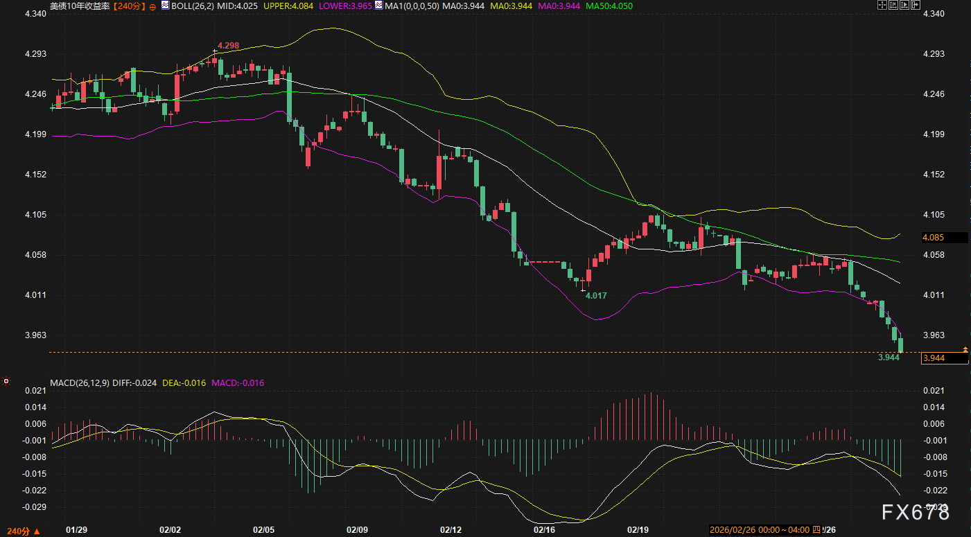 3. 债市:10年期美债收益率的加速下行 技术面背景: 最新报价3.944,已击穿布林带下轨(3.965),空头力量占优。 exness官网:逻辑分析: 市场避险情绪将迫使资金流向美债。收益率的加速下跌反映了资金对安全性的极致渴求。未来周初,收益率可能进一步下探3.900关口。