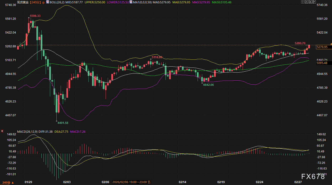 基本面衔接: exness官网: 霍尔木兹海峡的流量中断若达到70%以上,市场将不再关注基本供需,而是直接交易“供应真空”。知名机构分析师指出,若中断持续,油价可能在周一开盘即出现5-10美元的跳空,甚至直接冲击80-100美元区间。由于美国明确表示暂不释放战略石油储备,油价的向上阻力极小。 2. 避险资产:现货黄金与避险货币 现货黄金: 技术面: 周五最高触及5280.70美元,远超布林带上轨(5250.00)。均线多头排列,MACD柱值持续放大。 逻辑分析: 地缘政治不确定性是黄金最强的催化剂。在哈梅内伊身亡这种“改变历史进程”的事件面前,投资者将集体涌向安全地带。