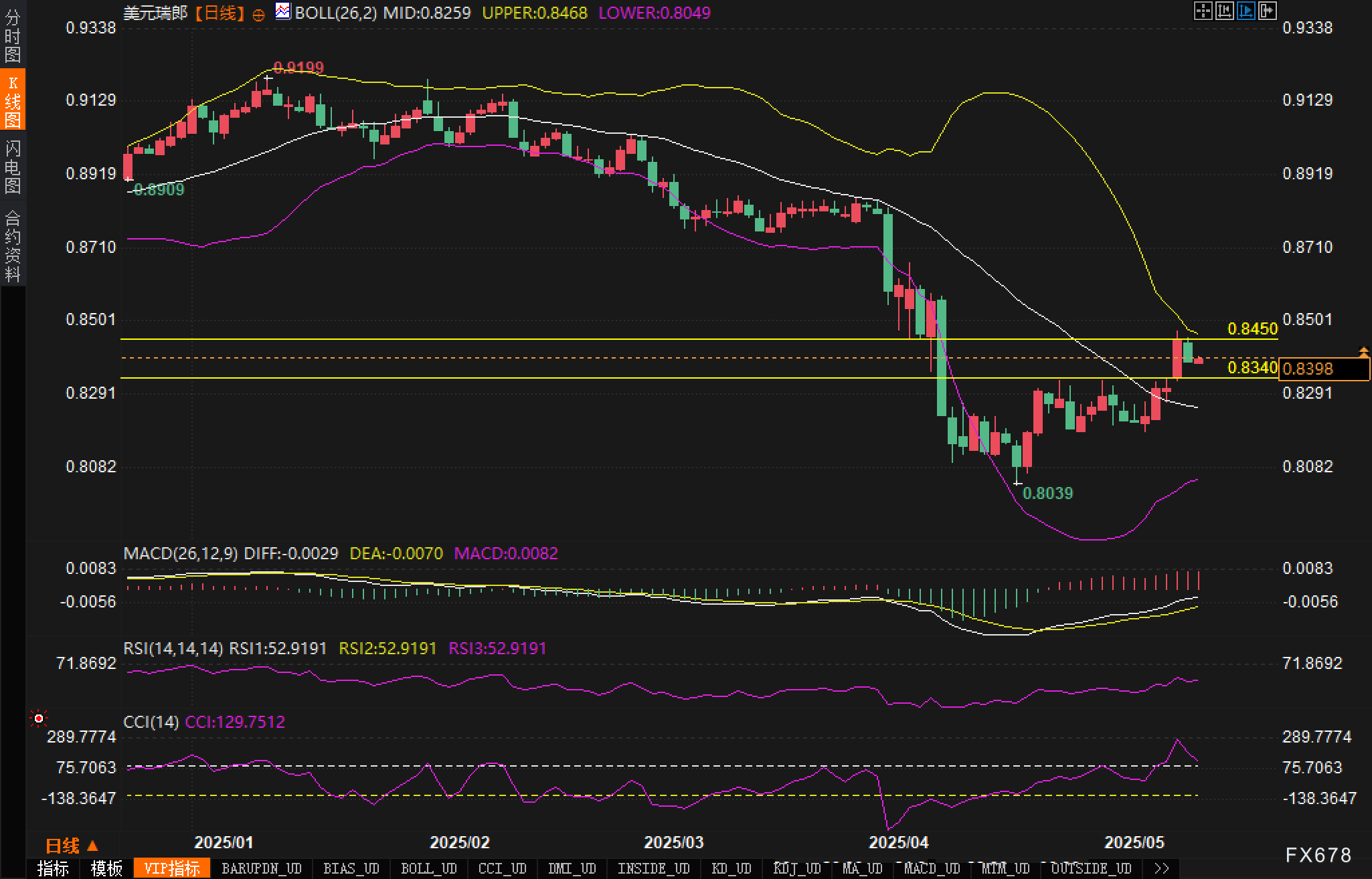 周三(5月14日),美元兑瑞郎汇价窄幅盘整,亚洲时段交投于0.8390附近。在经历四月的急剧下跌后,汇价正尝试筑底企稳,但技术指标显示下行风险依然存在。与此同时,全球贸易关系改善与美联储政策前景变化,正在重塑市场风险情绪,进而影响瑞郎这一避险货币。