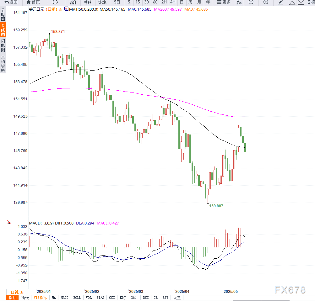 从日线图来看,USD/JPY在5月初冲高至148.65附近后形成“双顶形态”,并在失守20日均线(现位于146.40附近)后加速回落,显示顶部已初步确立。