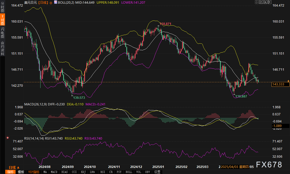 布林带观察:汇价目前位于中轨(144.65)和下轨(142.20)之间,短期偏空但未进入超卖区域。
