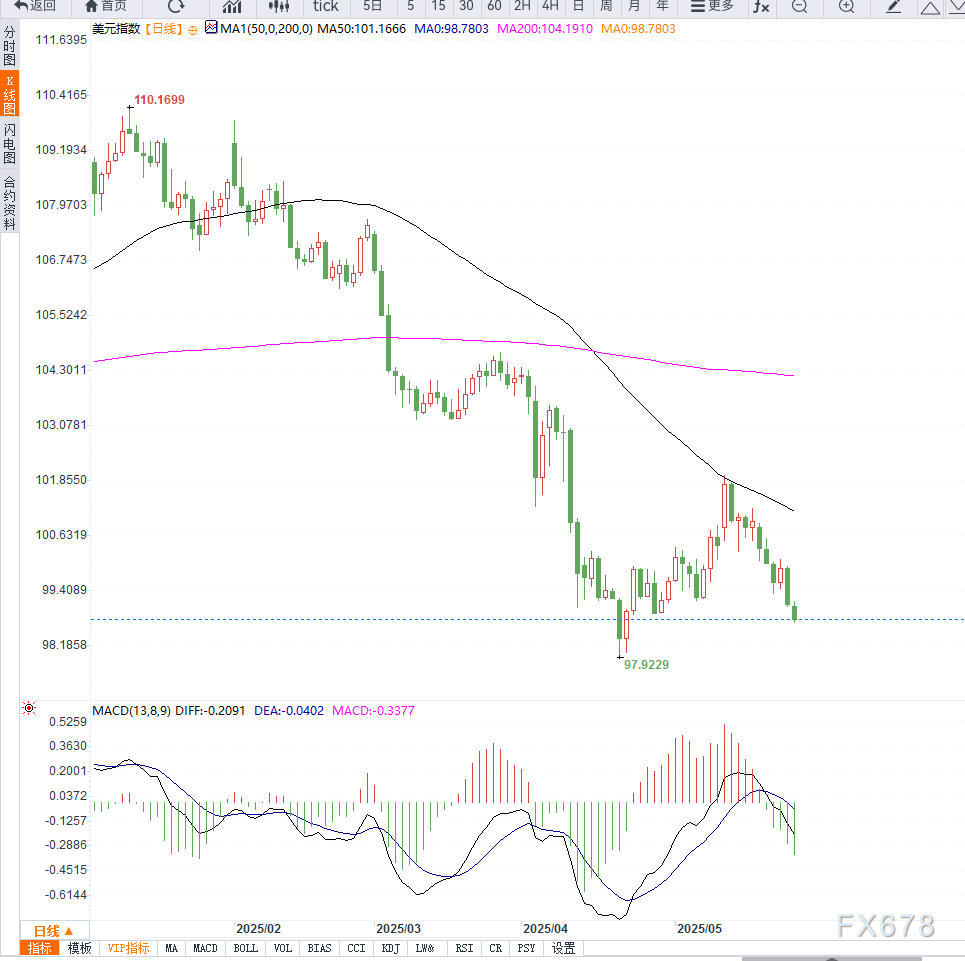 周一跌幅达到0.3%,较5月初高点已累计回落近3%。美元在节假日期间交投清淡,但整体弱势格局明显。技术面上,若跌破98.50关键支撑,美元指数恐进一步测试97.95的年内低点。