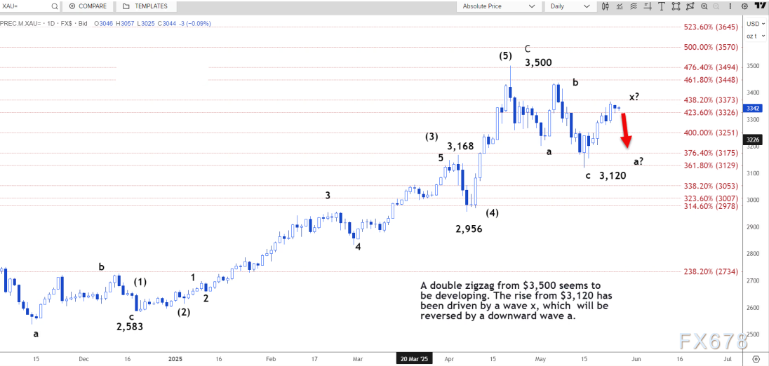 使这些障碍难以突破的是3355美元的阻力位,这是3501美元至3120美元下行趋势线的61.8%回撤位。金价下跌可能比上涨容易得多。