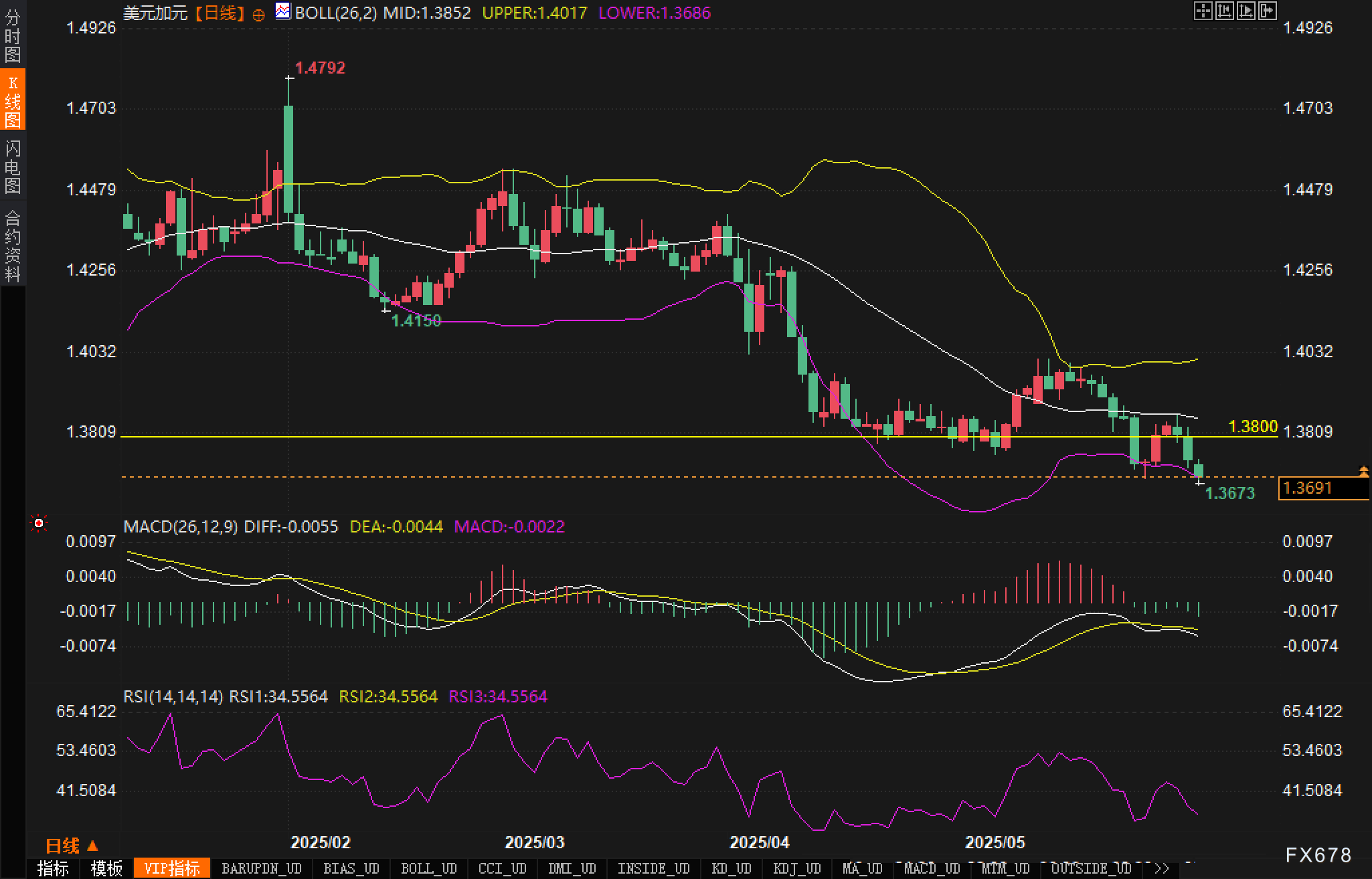 从日线图来看,美元/加元已经完全跌破关键支撑区域。汇价在跌破1.3800水平后加速下行,目前已经触及1.3673的年内新低。布林带显示,汇价正沿着下轨1.3686运行,中轨位于1.3852,上轨在1.4017,整体呈现明显的下降通道格局。值得注意的是,汇价在触及下轨后出现了轻微反弹迹象,但整体下行趋势依然完整。
