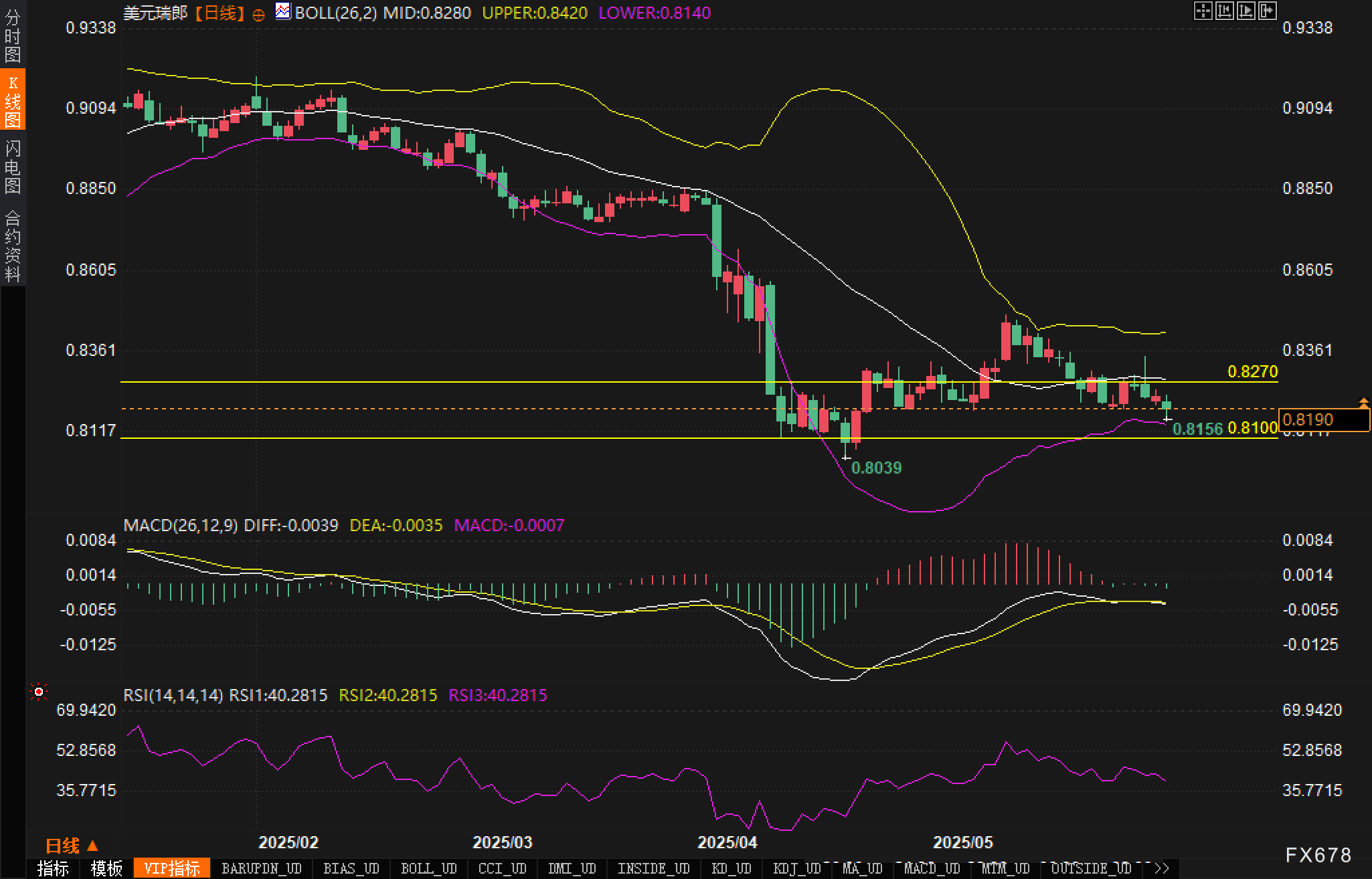 RSI指标显示,14日RSI为40.2815,处于弱势区域但尚未进入超卖区间。关键支撑位关注0.8156、0.8100和0.8039;阻力位则需留意0.82、0.8270和0.836。若汇价跌破0.8100整数关口,可能打开进一步下行空间。