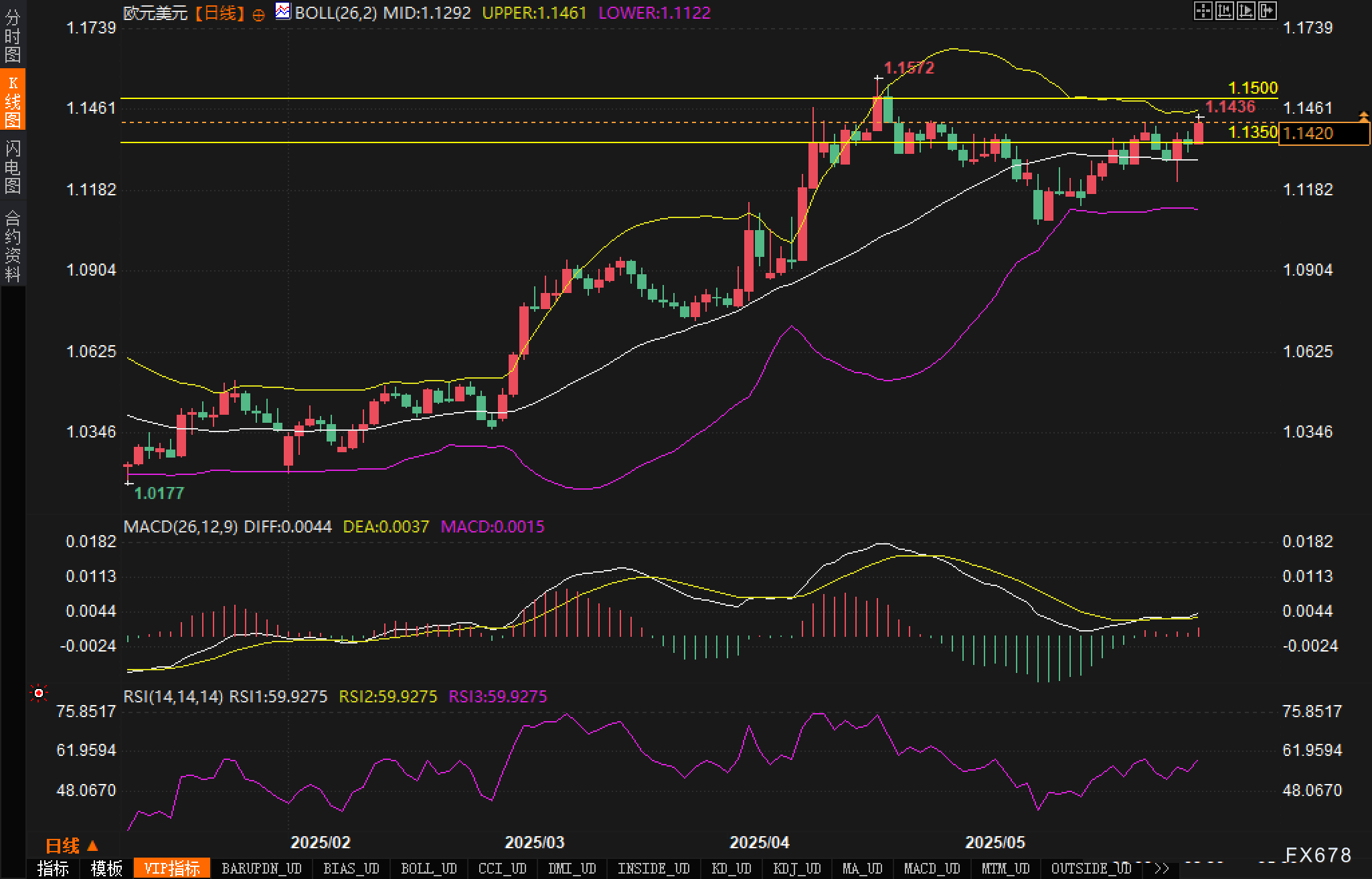 从日线图技术指标来看,汇价目前运行在布林带中轨1.1292上方,上轨1.1461和下轨1.1122构成了近期的波动区间。汇价在触及1.1572高点后展开回调,但在1.1350-1.1420区域获得较强支撑,显示多头仍具备一定控盘能力。