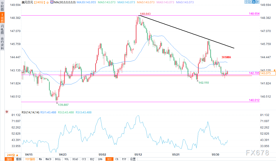 技术层面,美元/日元价格正在测试142.55水平的关键支撑位。价格交投于30周期简单移动平均线(SMA)下方,相对强弱指数(RSI)低于50,显示看跌倾向。近期价格跌破并维持在30周期SMA下方后转向下行。