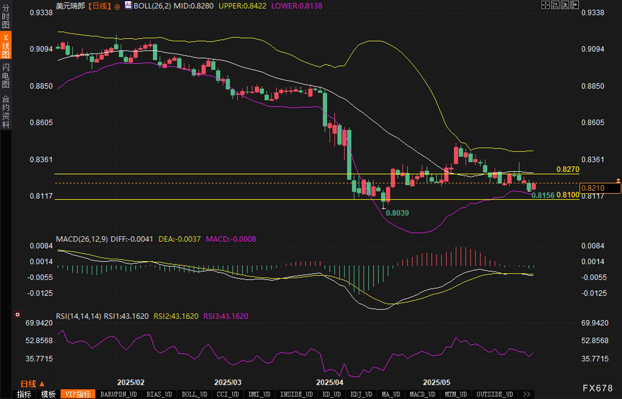 从图表上看,汇价在快速探底至0.8039后,出现技术性反弹并逐步进入横盘震荡区间。当前汇价运行于布林带中轨下方,且短期均线压制明显。0.8270构成上方强阻力,而下方0.8100至0.8156一线构成关键支撑带。