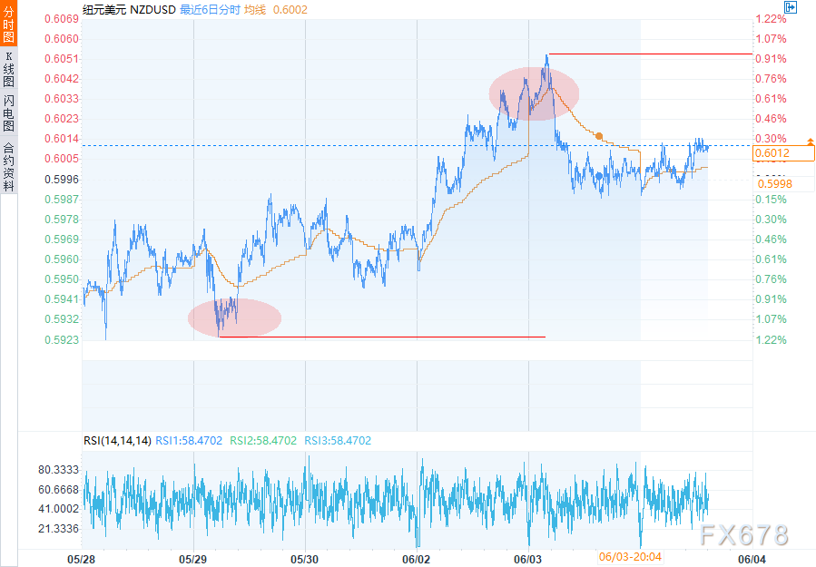 exness外汇官网——周三(6月4日)欧盘时段,纽元/美元分时图上价格有明显波动,呈现多波上涨与回调。均线在 0.6011 附近,相对平稳。