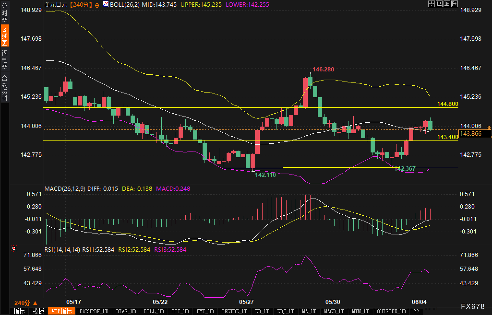 当前美元/日元处于240分钟K线图的布林带中轨附近震荡,布林带开口略微收敛,显示波动率有所收敛。汇价近日自142.367附近反弹,但反弹至144上方后再度遇阻,尚未形成有效突破。当前布林中轨位于143.745,构成短线支撑,若失守则需关注布林下轨142.255及前低142.110的支撑强度。