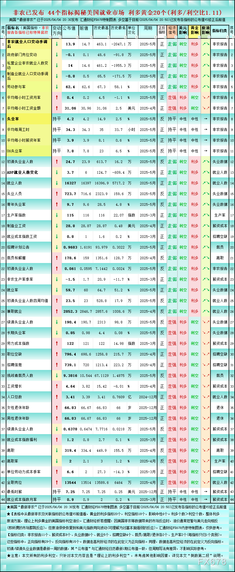 exness外汇官网——一张图:美国非农已发布 44个美国就业关联指标 利多黄金的20个。美国“最新非农”已于2025/06/06 20:30发布,市场密切关注。堪称金融市场必备打卡的美国非农”,此次非农后44个美国就业指标整体如何?一张图让您一目了然。