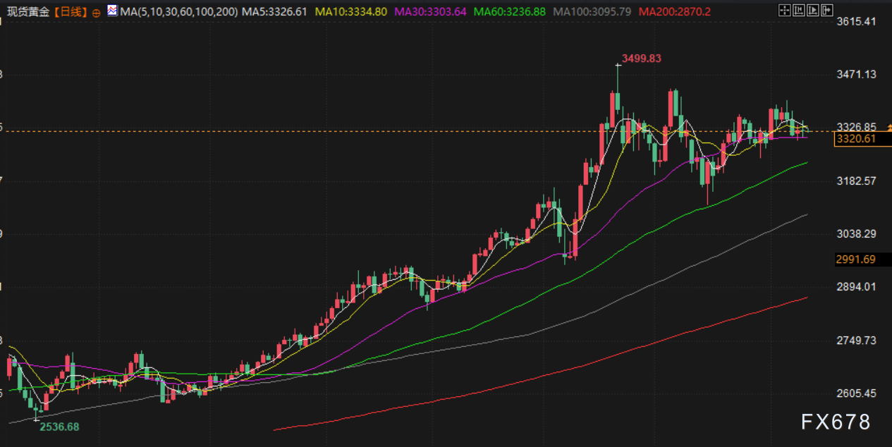 金价周二小幅走低,交易员密切关注贸易谈判,其结果可能缓解贸易紧张局势并提振全球经济,从而减少对避险资产的需求,而美元升值增加了金价压力。现货金下跌 0.1%,至每盎司3324.55 美元,美国期金结算价下跌0.3%,至3343.40美元。