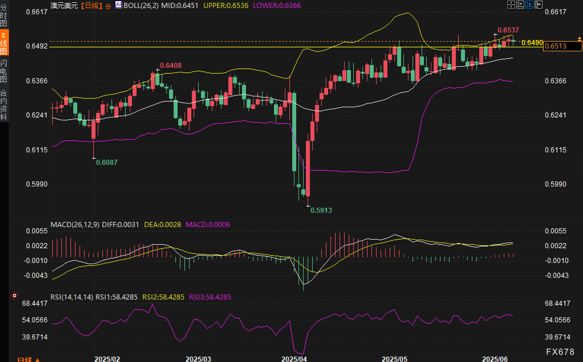 分析认为若汇价后续能有效站稳0.6536并突破0.6555结构性阻力,则有望打开上行空间,挑战2024年末高位区域;反之,一旦跌破0.6485-0.6500支撑带,则短线上涨动能恐将暂歇,重新进入布林中轨一线盘整。