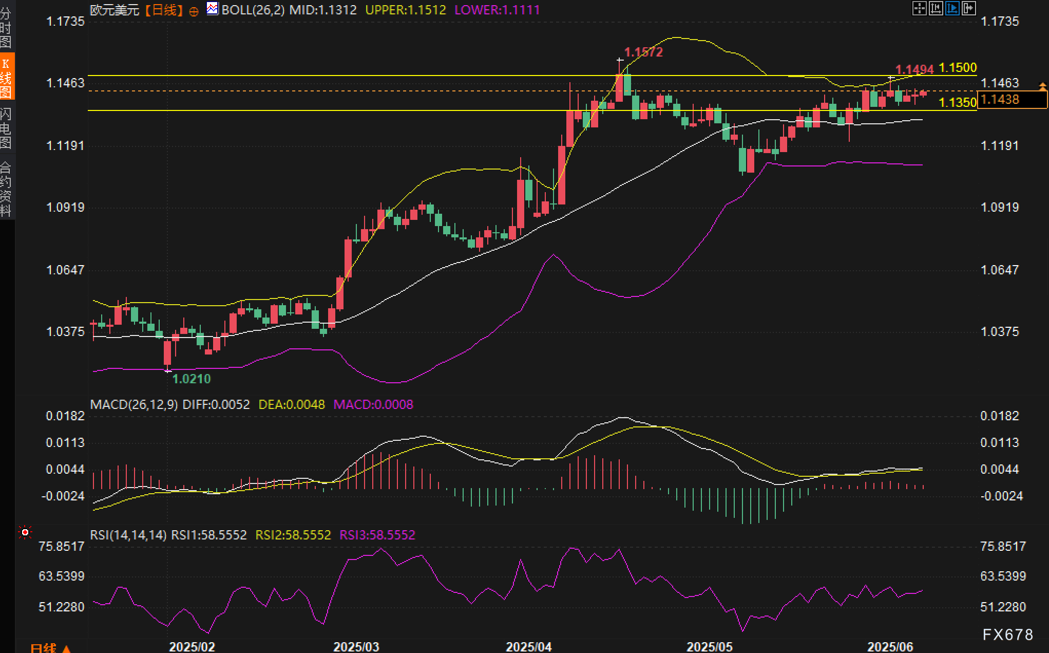 从日线图观察,欧元/美元仍运行在布林带中轨上方,布林带开口略有收敛,显示当前市场处于波动率收缩阶段。近期K线反复受阻于1.1455附近阻力区间,构成明显的顶部结构,该位置亦与前期高点1.1494-1.1500重叠,为重要阻力密集区。下方支撑参考1.1400区域,若失守,或测试1.1350一线附近的布林带中轨支撑。