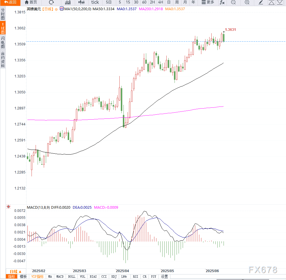 从技术图形看,英镑/美元近期高位承压回调,短线支撑位于1.3500关口,若跌破则可能进一步下探至1.3450甚至1.3400区域。上方初步阻力关注1.3600整数位,若有效突破则有望重新上探1.3650及1.3700区域。