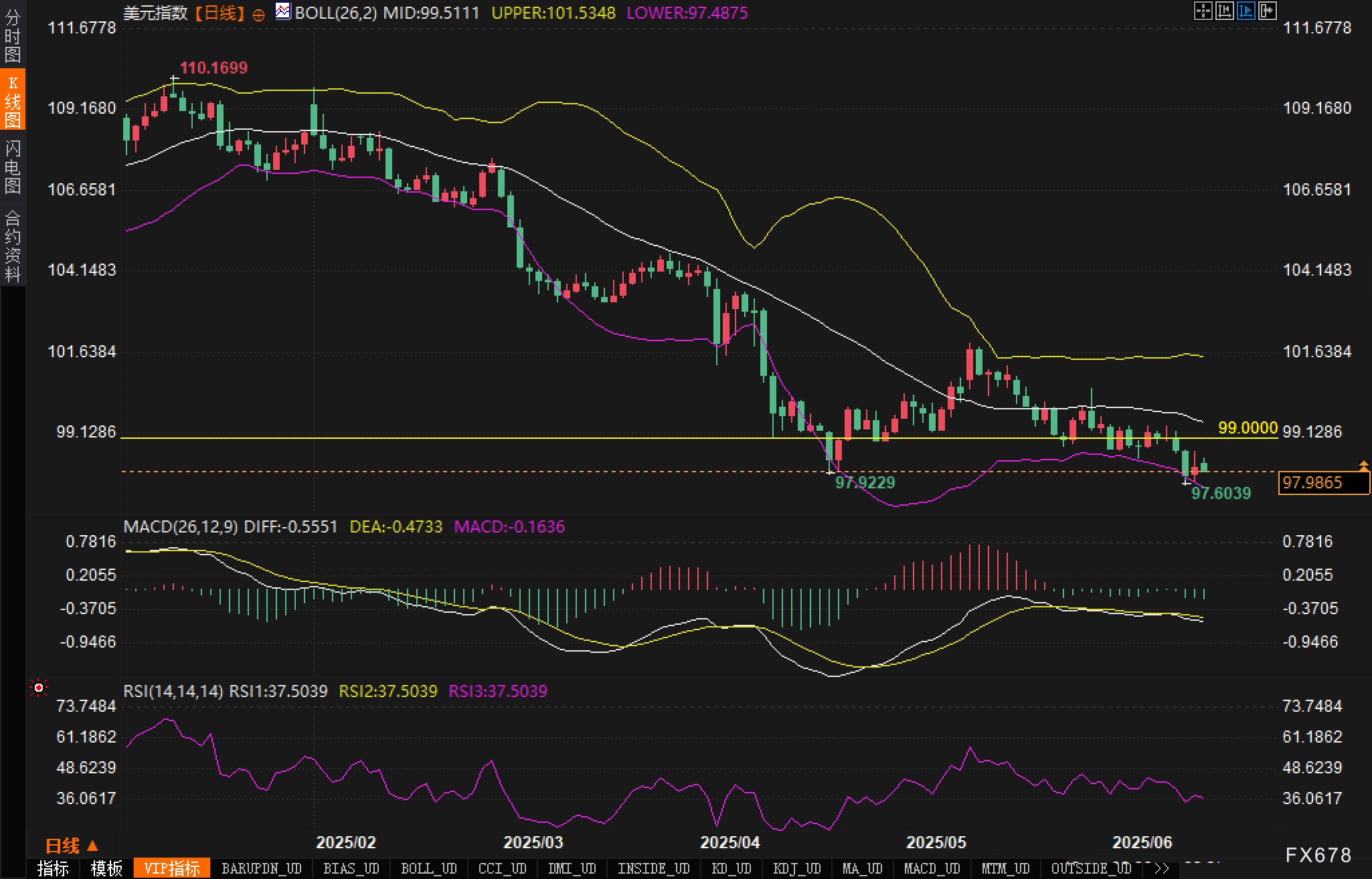 从日线图表结构来看,美元指数呈现出明显的下降趋势特征。价格自110.1699的高位开始,经历了一轮深度调整,当前运行在98附近。