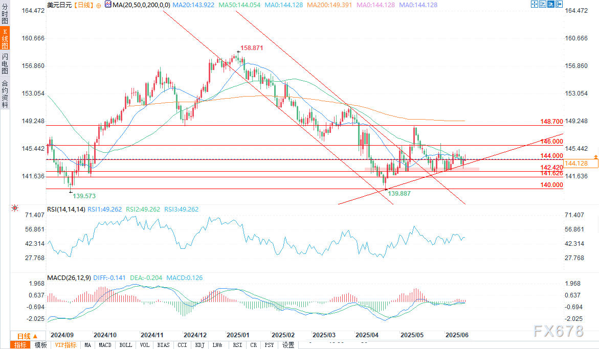 若多头突破146,涨势可能延伸至5月高点148.65;若空头跌破142,则可能打开通往2025年低点140的大门。