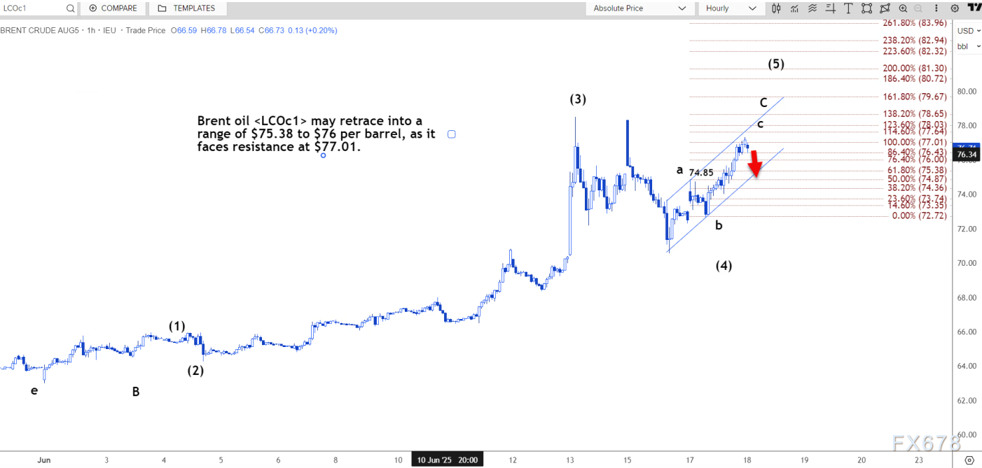 上升通道暗示回调目标位在75.38美元,因为此次回调幅度可能与自74.85美元以来的回调幅度相同。突破77.01美元后,可能进一步上涨至78.03-78.65美元区间。
