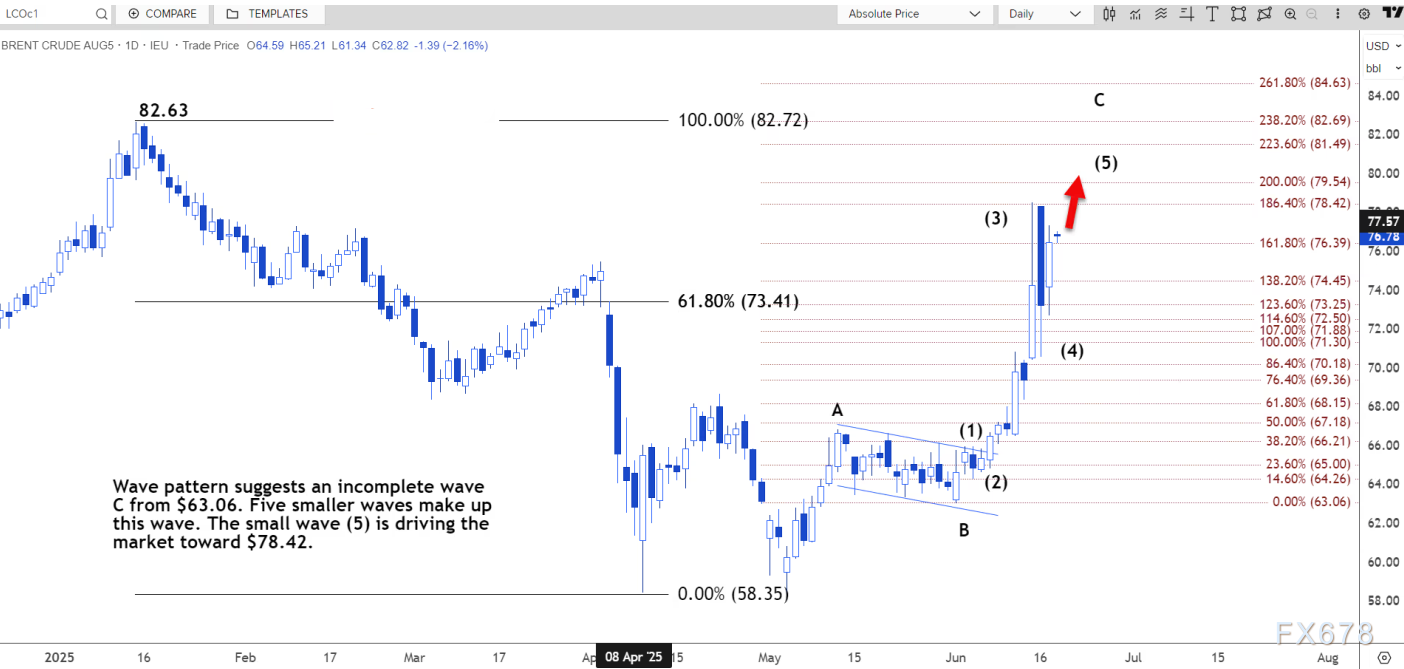 然而,如果(5)浪最终成为失败的第五浪,上行空间可能不止于78.42美元。事实上,这波浪有可能延伸至更高的目标区域82.69-84.63美元。