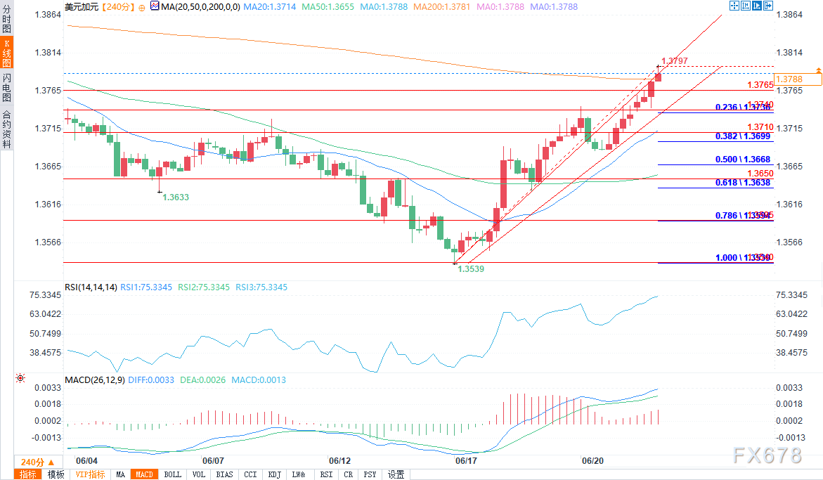 多头将美元/加元推至1.3640和1.3700水平上方。美元/加元上破了200简单平均线1.3781,高点形成于1.3797,该货币对目前正在盘整。