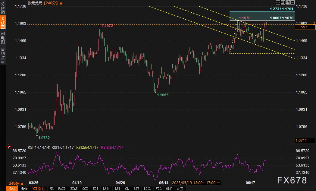 1. 看涨旗形突破有效性确认:汇价突破1.1540趋势线阻力后,量度目标指向1.1700附近,该位置对应6月10-12日反弹浪的127.2%斐波那契扩展位;